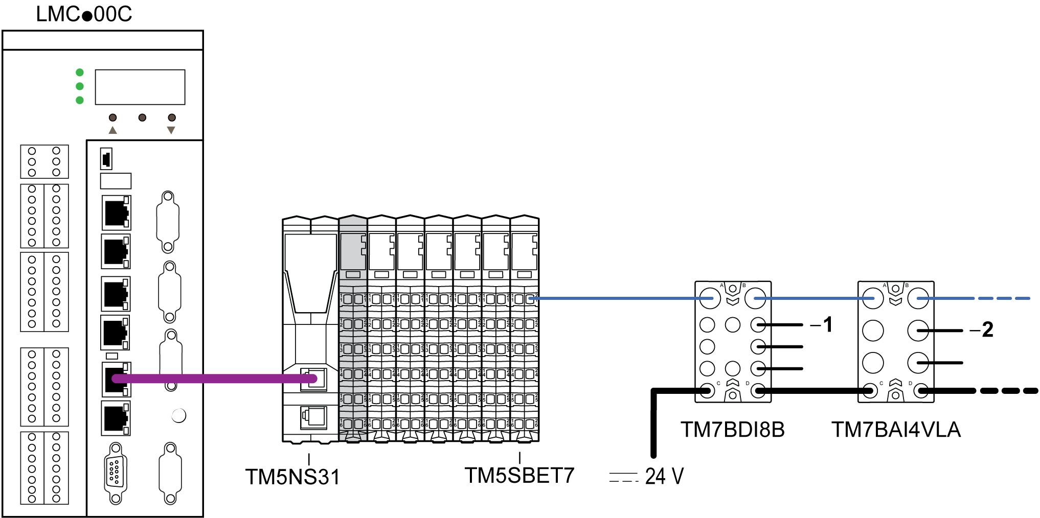 Connect the sensors to the analog inputs of the TM7 I/O blocks