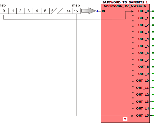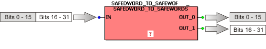 This function block splits one (SAFE)WORD input variable to 16 (SAFE)BOOL output variables.