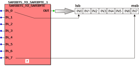 This function block summarizes eight (SAFE)BOOL input variables to one (SAFE)BYTE output variable.