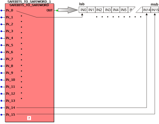 This function block summarizes 16 (SAFE)BOOL input variables to one (SAFE)WORD output variable.