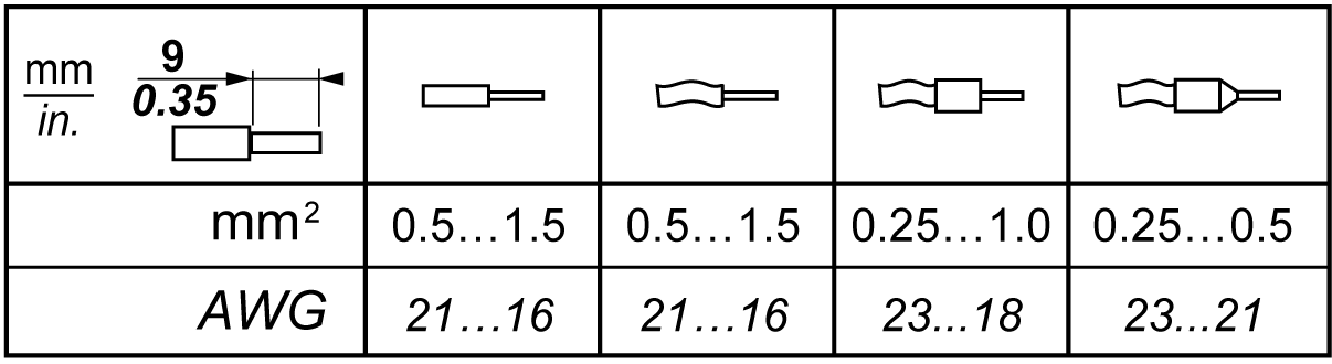 The following tables show the cable types and wire sizes for a 3.81 pitch removable screw terminal block (I/Os and power supply):