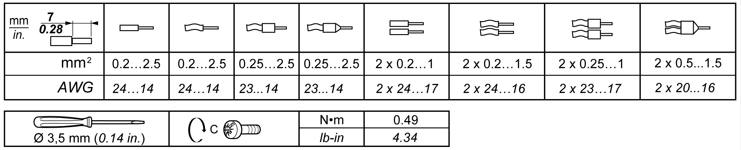 The following tables show the cable types and wire sizes for a 5.08 pitch removable screw terminal block (I/Os and power supply):