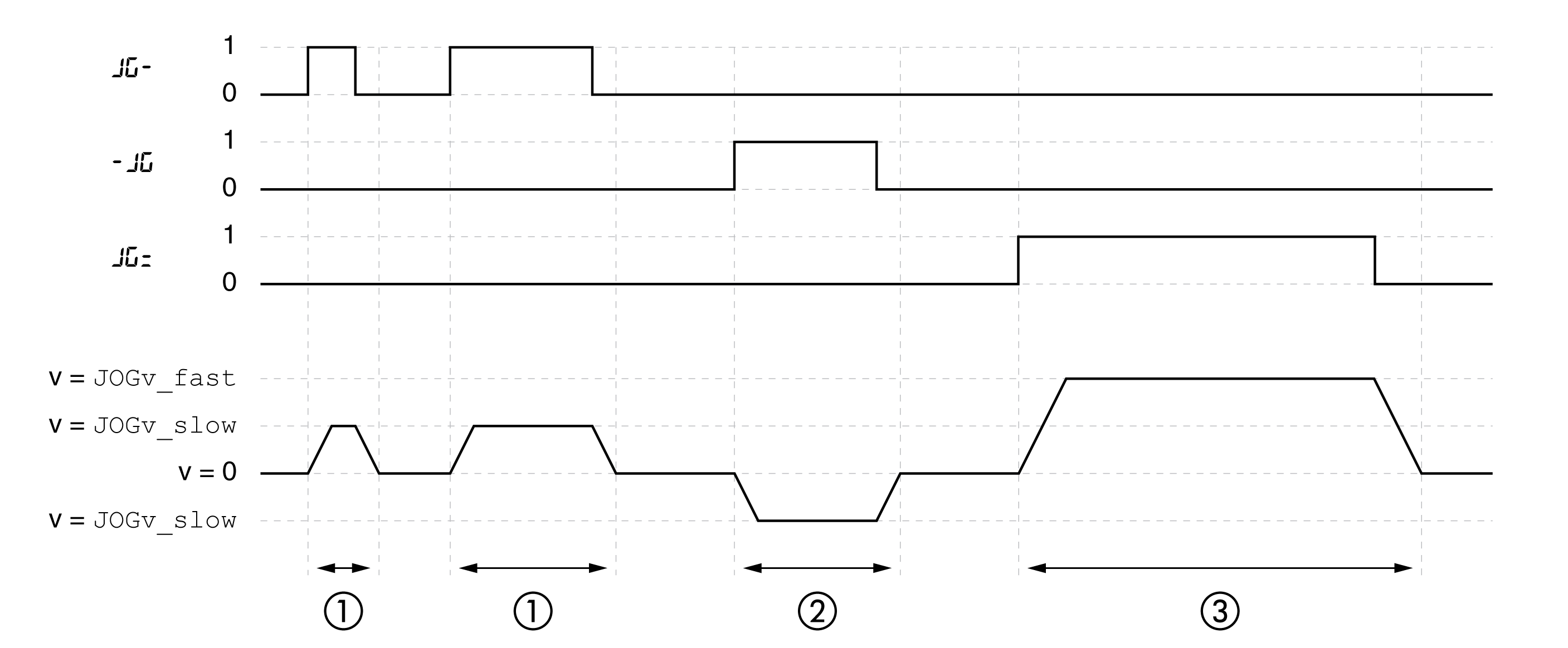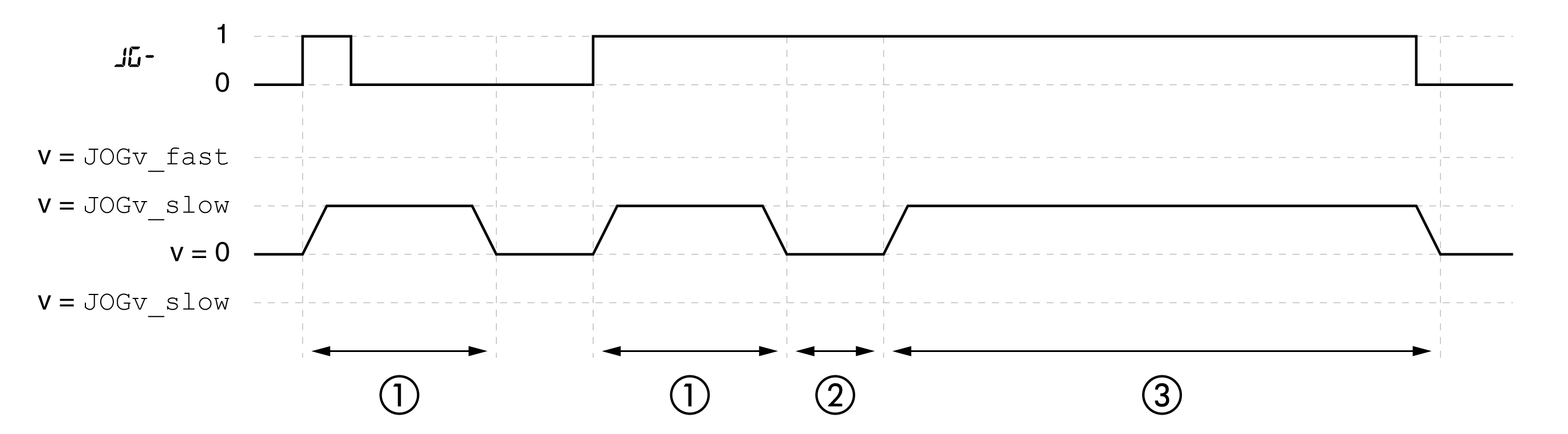 Si está presente la señal para la dirección de forma permanente, primero se efectúa un movimiento con un número parametrizable de unidades de usuario en la dirección deseada. Después de este movimiento se detiene el motor durante un tiempo definido. A continuación se efectúa un movimiento continuo en la dirección deseada.