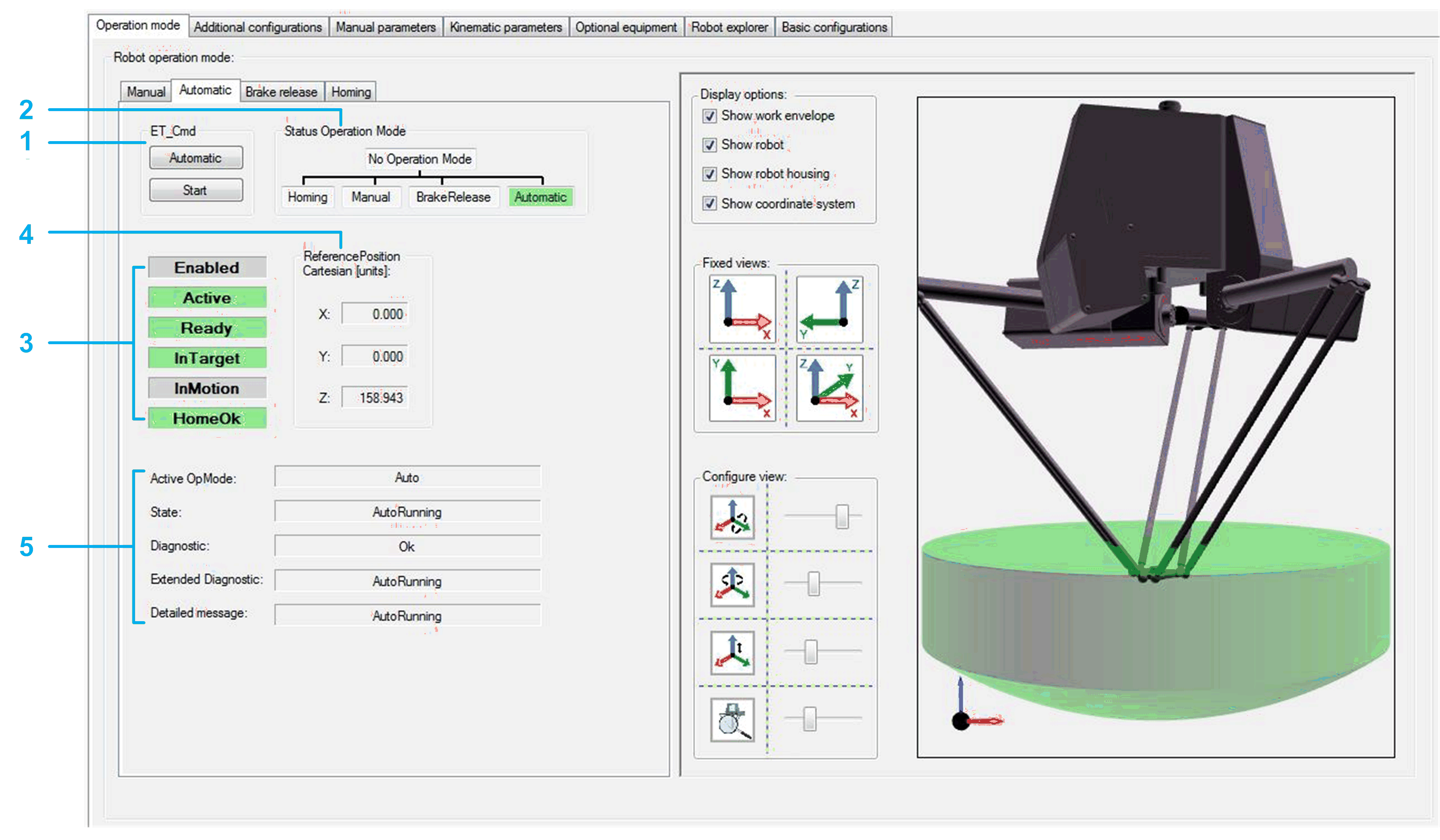 If the module is not in the operation mode , click the button to send the command RM.ET_Cmd.Auto, and then click the button to send the command RM.ET_Cmd.Start. If the operation mode is accepted, the background color of the operation mode status switches to green. |