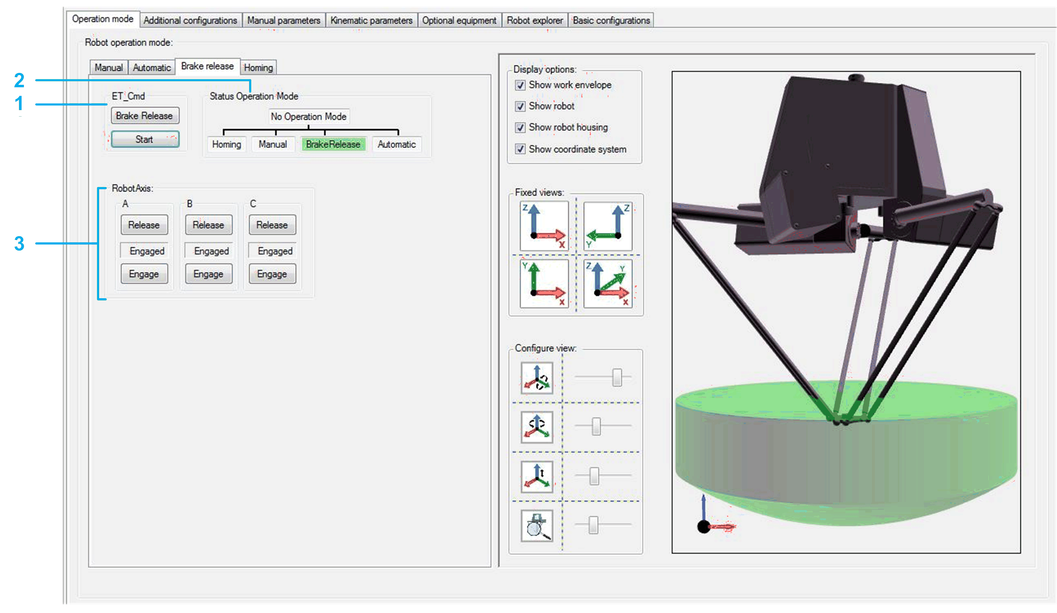 Activate the check boxes to define what is displayed in the (work envelope, robot, robot housing, coordinate system). |