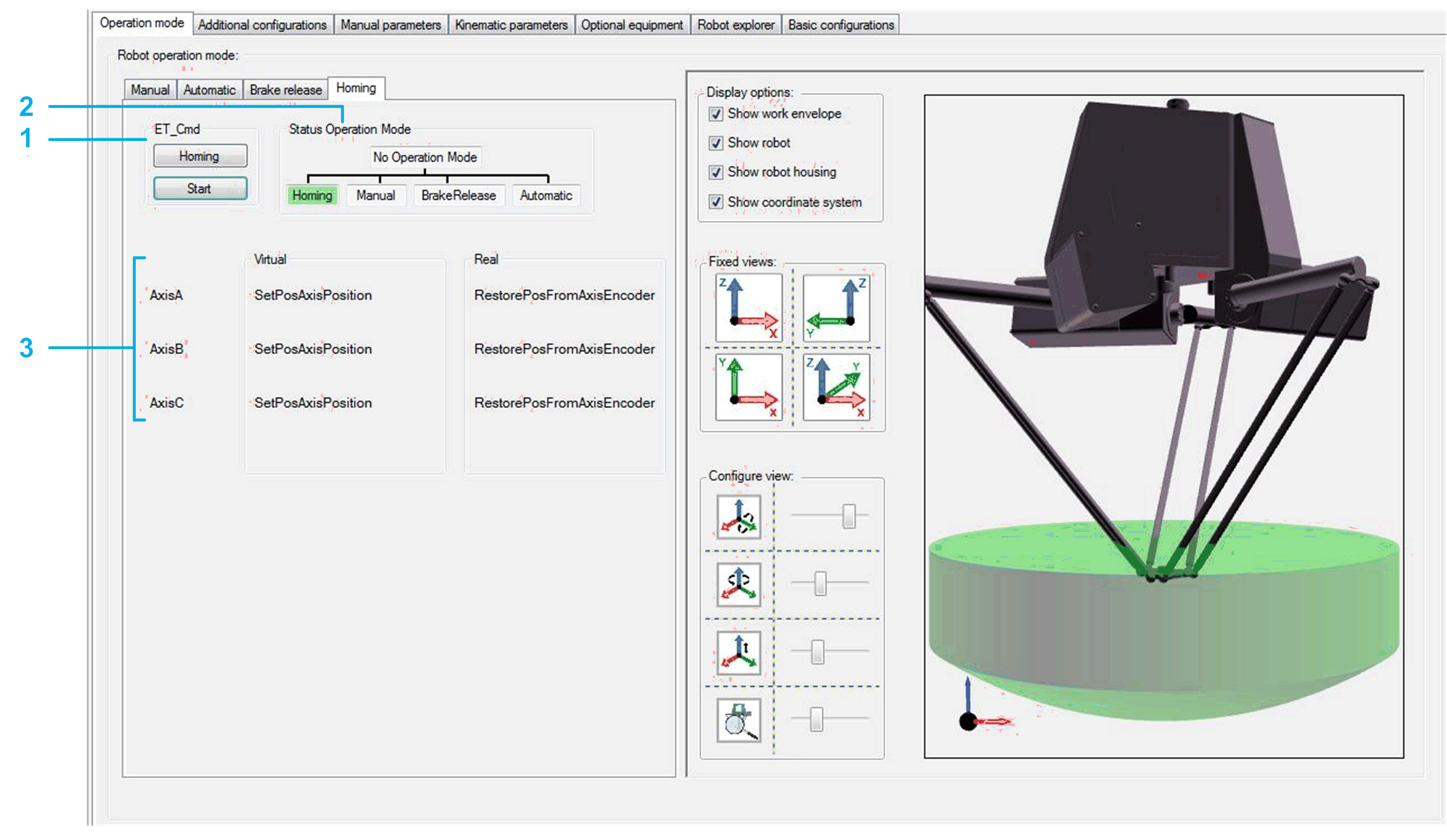 The left-hand side of the tab displays the homing mode of the robot axes.