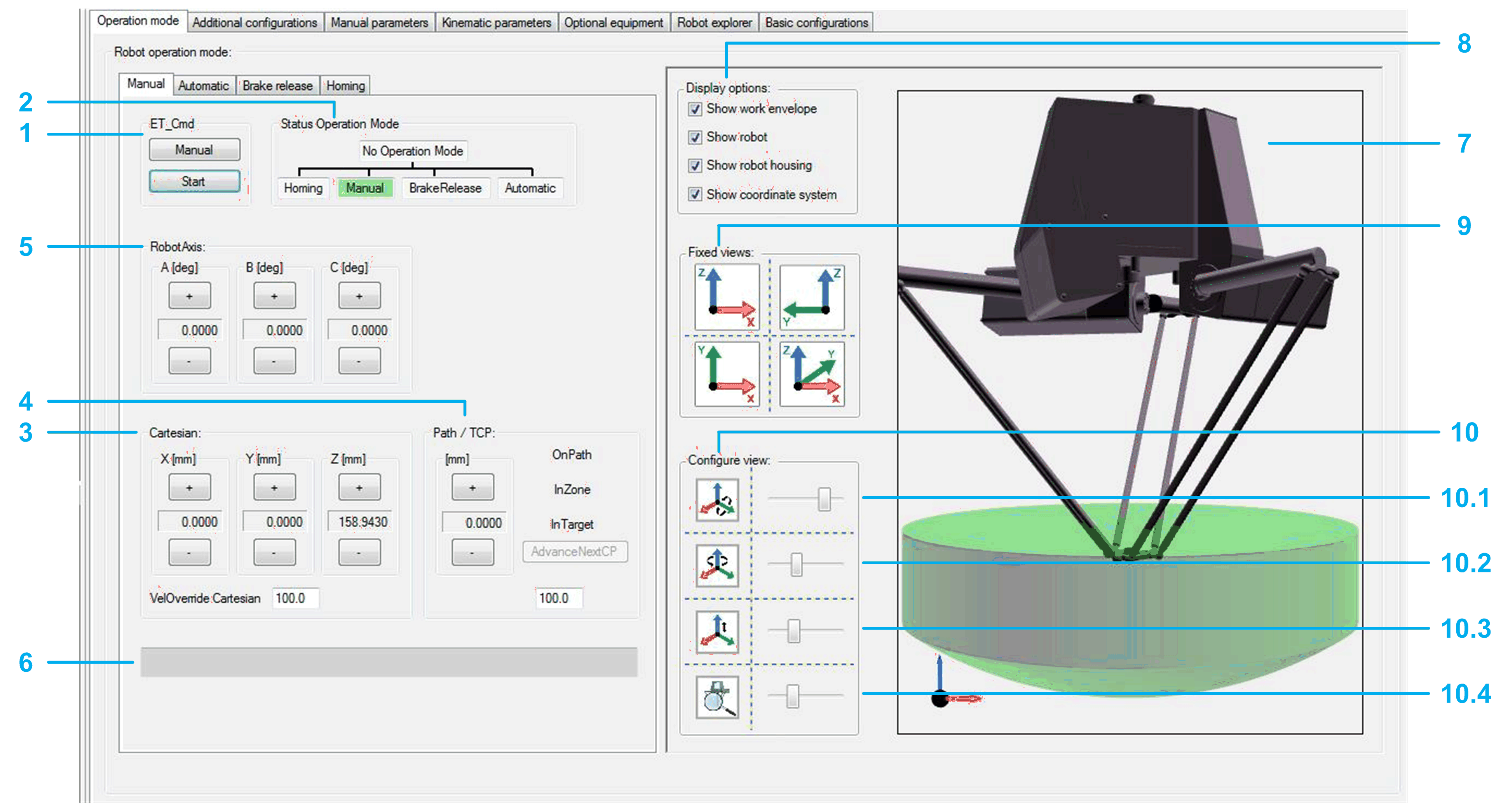 Displays the operation mode of the module. If the robot is in operation mode, you can move the robot step-by-step with the buttons of the various jogging modes: