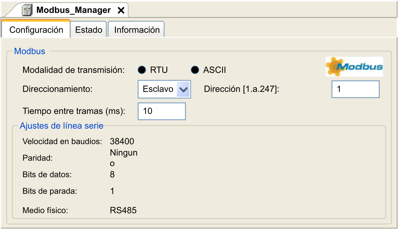 El gestor Modbus se utiliza para el protocolo Modbus RTU o ASCII en modo maestro o esclavo.