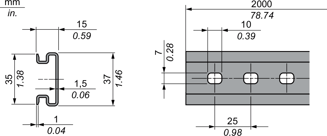 En la ilustración y la tabla siguientes se indican las referencias de los rieles DIN simétricos (segmento DIN) de 2000 mm (78,74 pulg.):