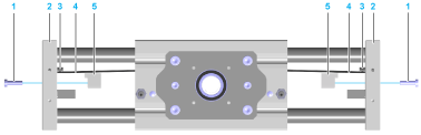 Appliquez une fine couche de colle de fixation de force moyenne sur les vis de réglage de la tension (1) et insérez celles-ci à travers les plaques d'extrémité dans les pièces de serrage de la courroie crantée. |