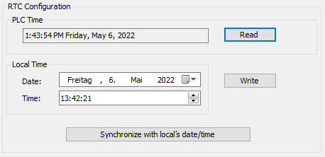 Defines a date and time to send to the controller when you click the Write button. If necessary, modify the default values before clicking the Write button. A message box informs you about the result of the command. The date and time fields are initially filled with the PC settings. |