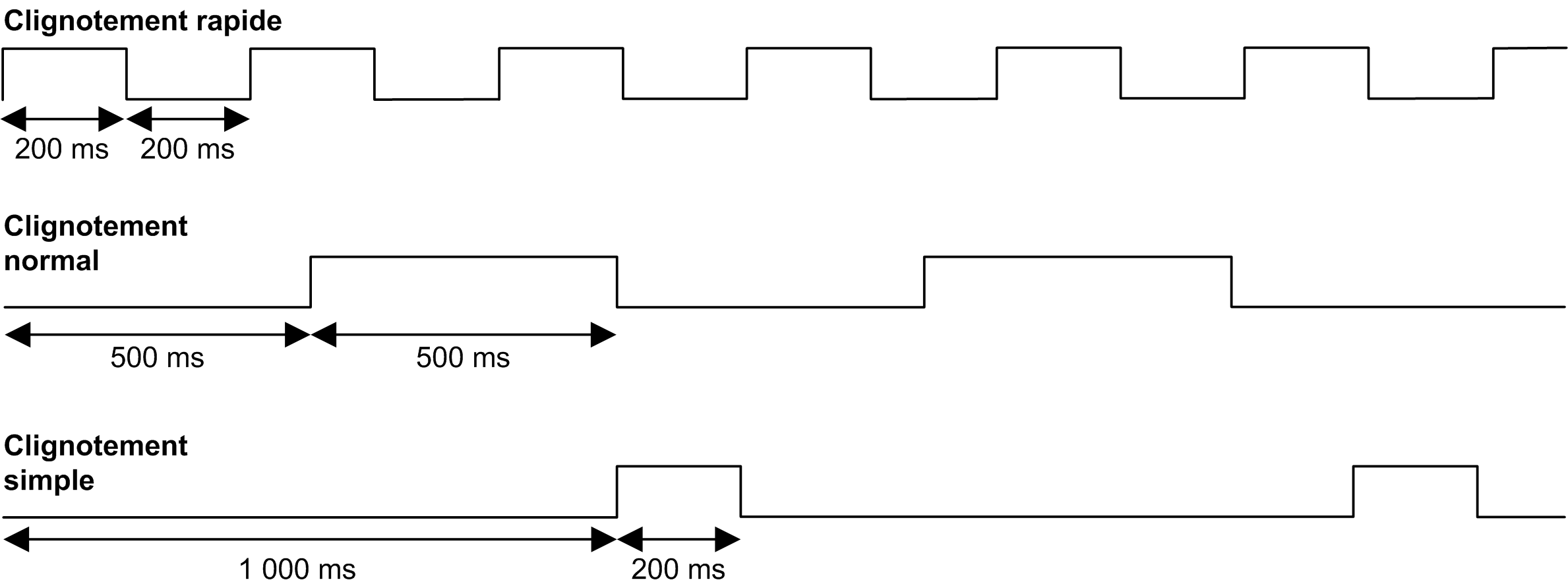 Ce schéma de temporisation montre la différence entre le clignotement rapide, le clignotement régulier et le clignotement simple :
