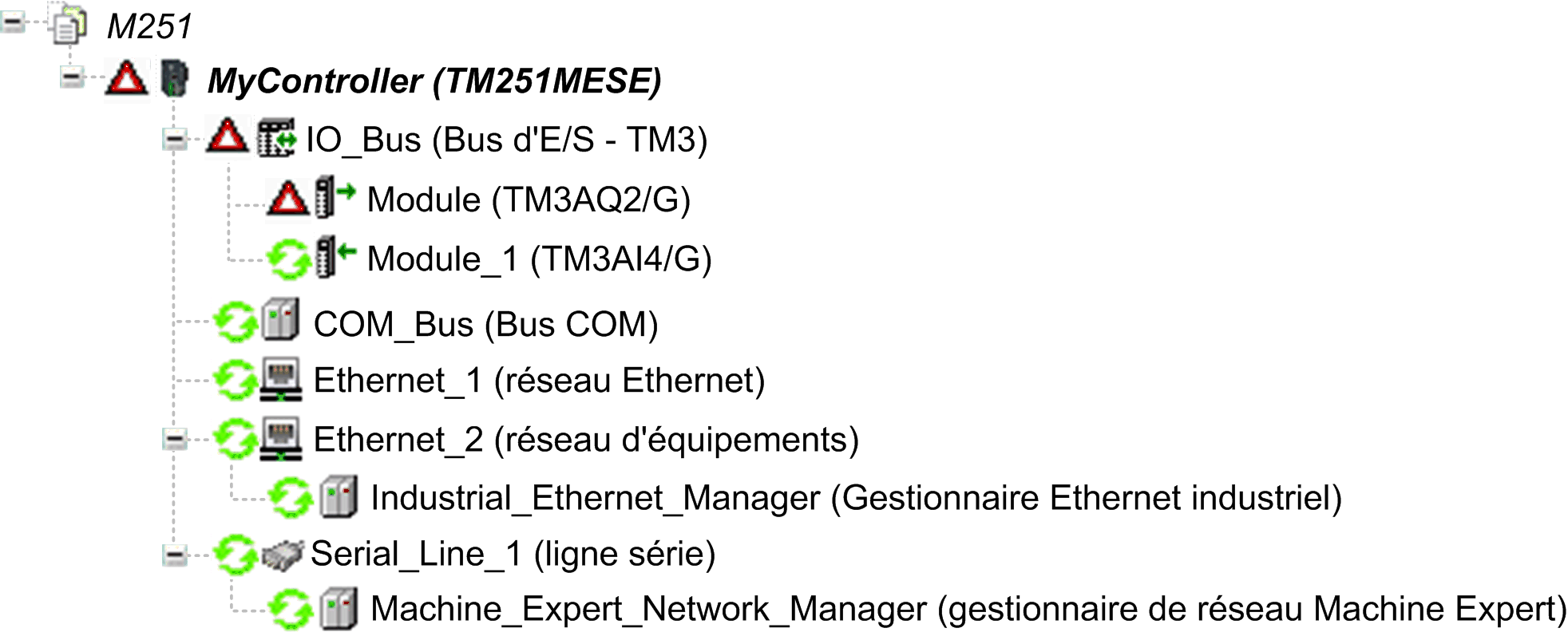 Lorsque EcoStruxure Machine Expert est en mode en ligne, un triangle rouge apparaît en regard du ou des modules d'extension TM3 en erreur et en regard du noeud dans l'arborescence .