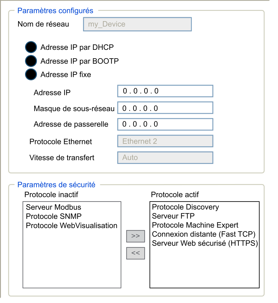 Ce paramètre désactive le protocole Machine Expert sur les interfaces Ethernet. Lorsqu'il est désactivé, toute requête Machine Expert provenant d'un équipement est rejetée. Par conséquent, aucune connexion Ethernet n'est possible à partir d'un PC équipé de EcoStruxure Machine Expert, d'une cible IHM qui souhaite échanger des variables avec ce contrôleur, d'un serveur OPC ou de Controller Assistant. |