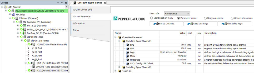 Manufacturer-specific tools (PDCT – Port and Device Configuration Tool) have to be used then to perform the often very complicated parameterization of IO-Link devices. CODESYS also provides a separate licensed IO-Link plug-in. This plug-in contains configurators which use the IO-Link device descriptions (IODD) to allow for convenient parameterization. Moreover, the generic (which mean transmitted as a byte stream) IO data of the IO-Link devices is prepared with the description data from the IODD. Another advantage is the backup of the IO-Link device parameters in the CODESYS project.