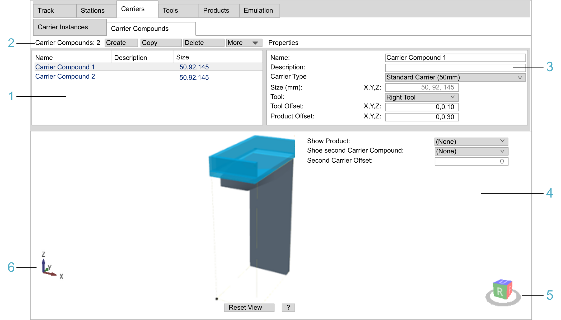 The View area displays the selected carrier compound with tools and products in a simplified 3-D graphical representation. |