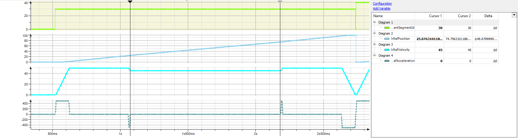 In the example, the reduced velocity of 45 was set for the configured zone between the connected path RefPosition 25...75, marked by the two cursors. The velocity is reduced before the start and increased again to the configured maximum velocity for the segment after the end of the configured zone.