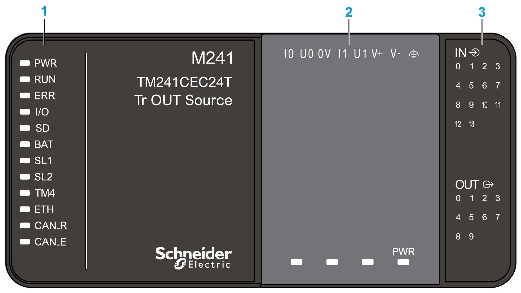 La figura seguente mostra i vari componenti del logic controller TM241CEC24T:
