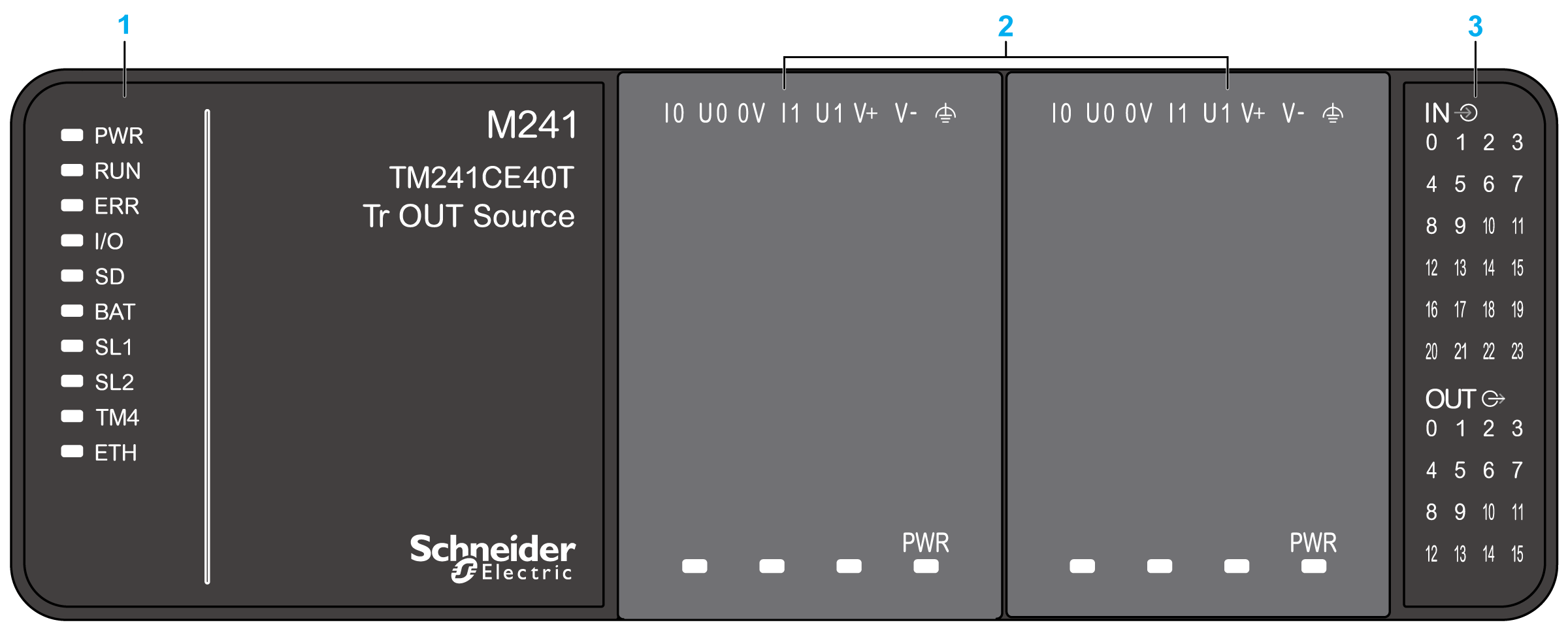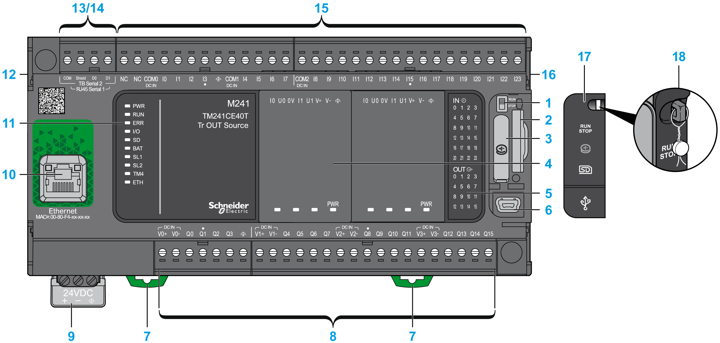 La figura seguente mostra i vari componenti del logic controller TM241CE40T: