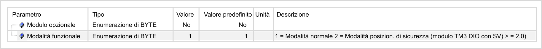 In Modalità normale (1), l'applicazione può impostare la variabile di sistema TM3_BUS_W.q_wIOBusErrPassiv su ERR_PASSIVE per utilizzare la gestione degli errori I/O passiva. Questa gestione degli errori consente la compatibilità con le versioni precedenti del firmware.