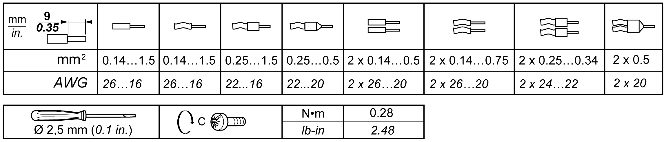 La seguente tabella mostra i tipi e le dimensioni dei cavi per una morsettiera a vite rimovibile con passo 3,81 (I/O e alimentazione):