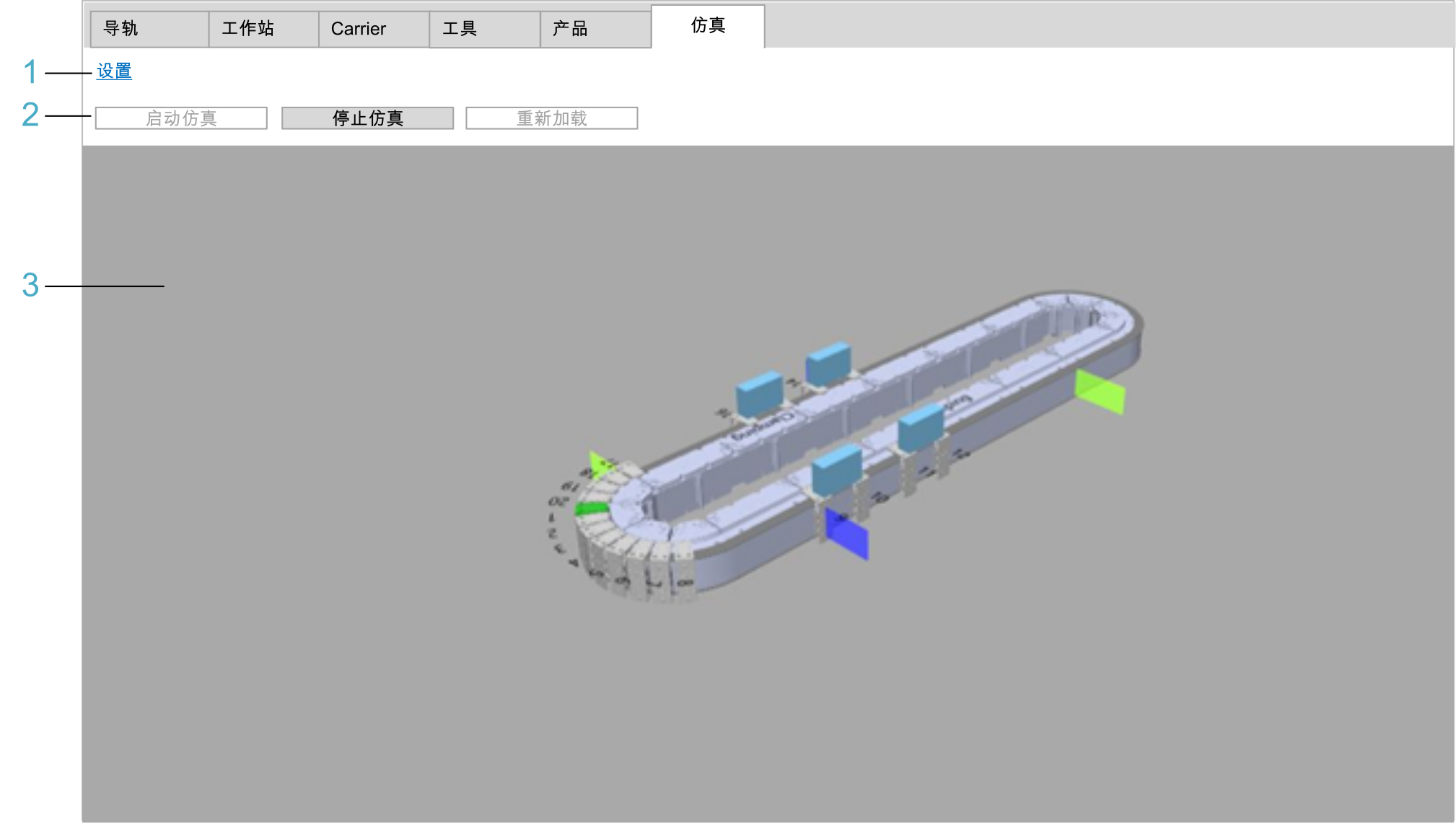 视图区域显示已配置对象的 3D 仿真,并您可以显示正在虚拟运行的对象。