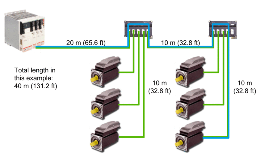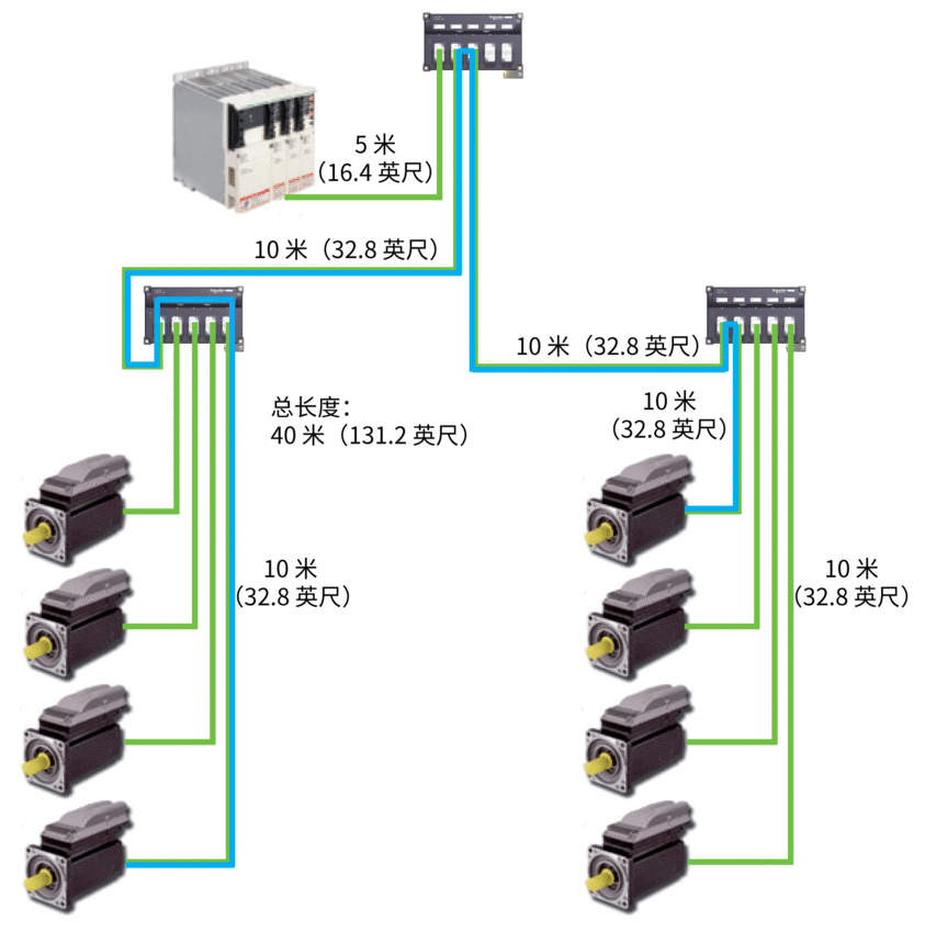 Lexium 62 Distribution Box 到 Lexium 62 ILM 的电缆长度不超过 10 米(32.8 英尺)。