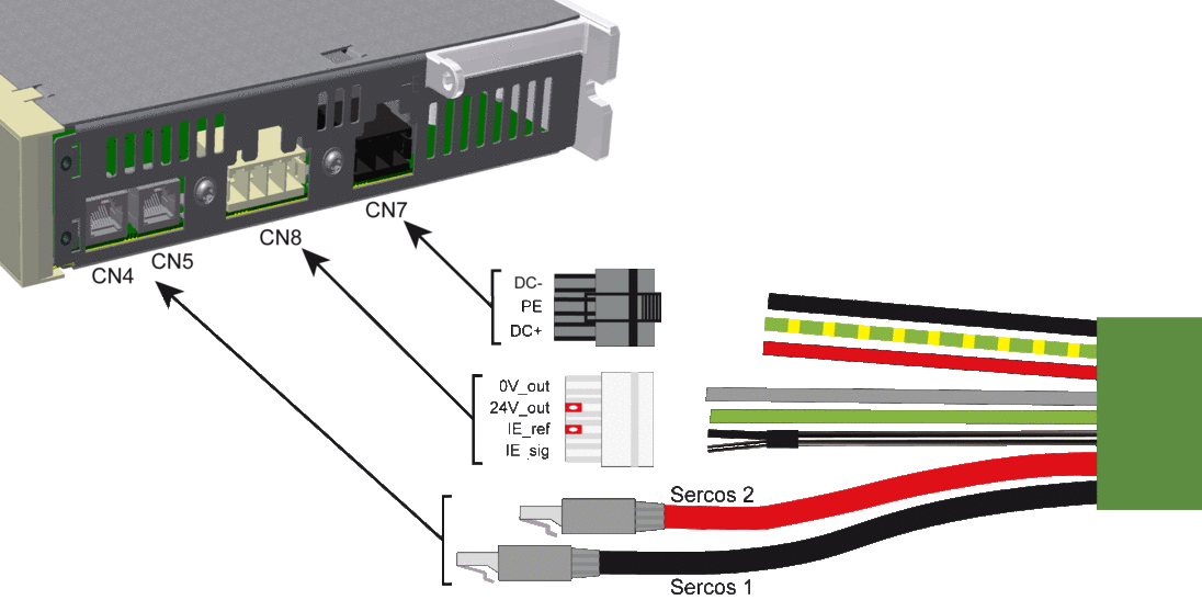使用预先组装的混合电缆将 Lexium 62 Connection Module 的接口 CN4、CN5、CN7 和 CN8(Sercos、直流总线电压、24 V、Inverter Enable)连接到 Lexium 62 Distribution Box。 |