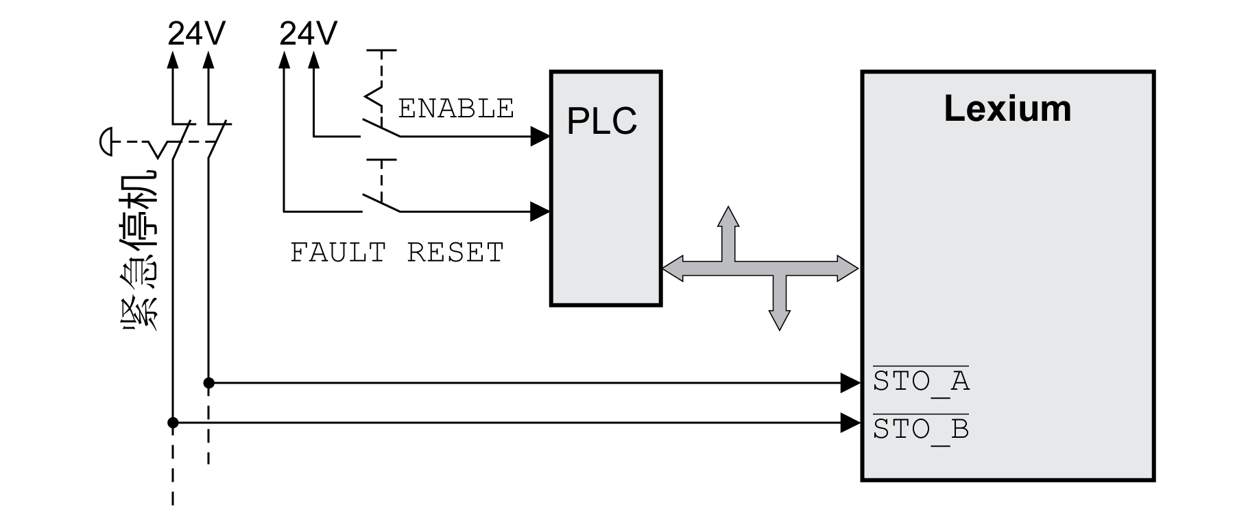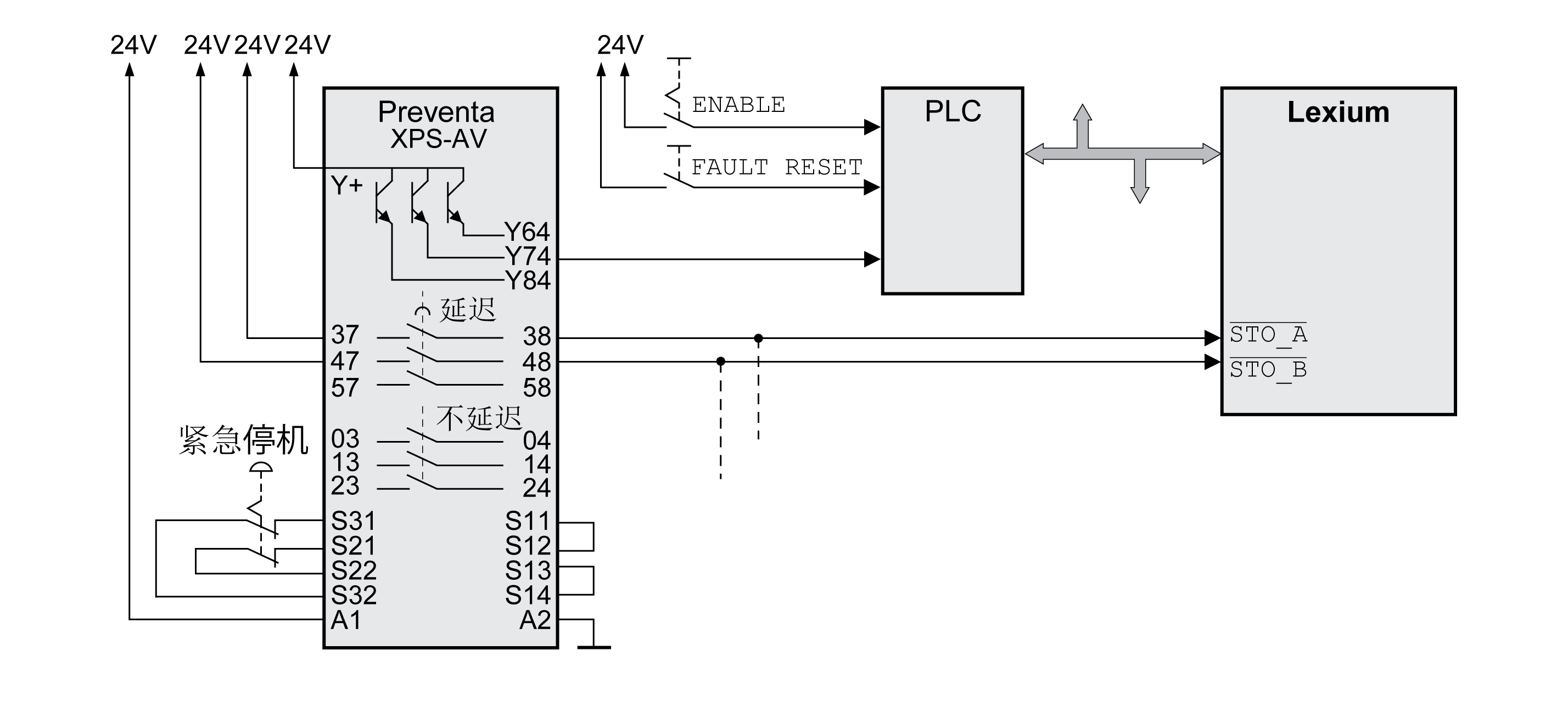 有外部 Preventa XPS-AV 紧急停机模块的停机类型 1 示例: