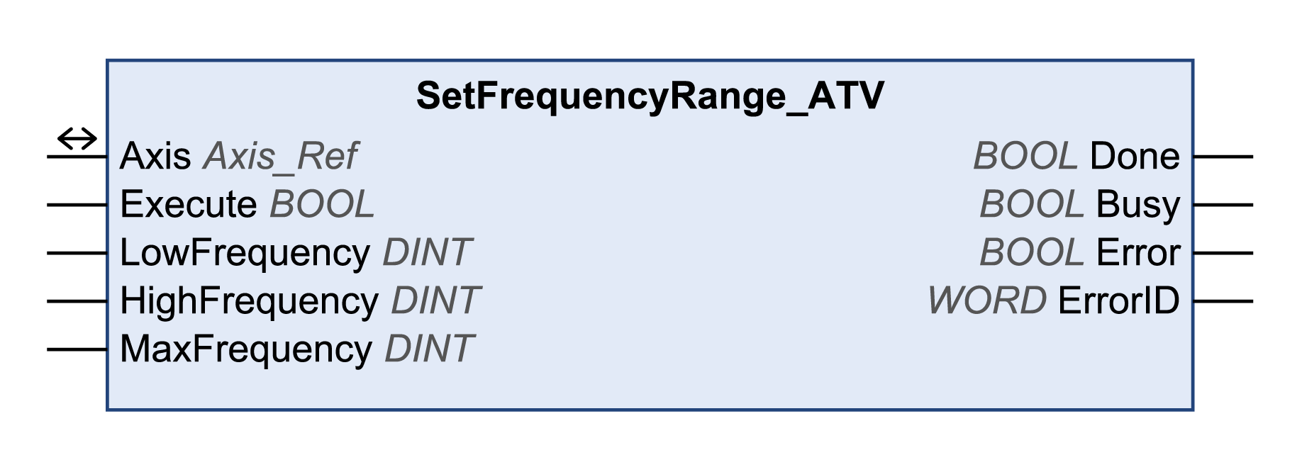 此功能块可配置用于功能块 MC_MoveVelocity 和 MC_Jog 的驱动器频率范围。如果频率(旋转速度)低于 LowFrequency 中的值,驱动器将会使用 LowFrequency 中指定的频率,但不会触发错误消息。如果频率(旋转速度)高于 HighFrequency 中的值,驱动器将会使用 HighFrequency 中指定的频率,但不会触发错误消息。