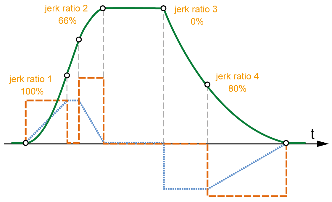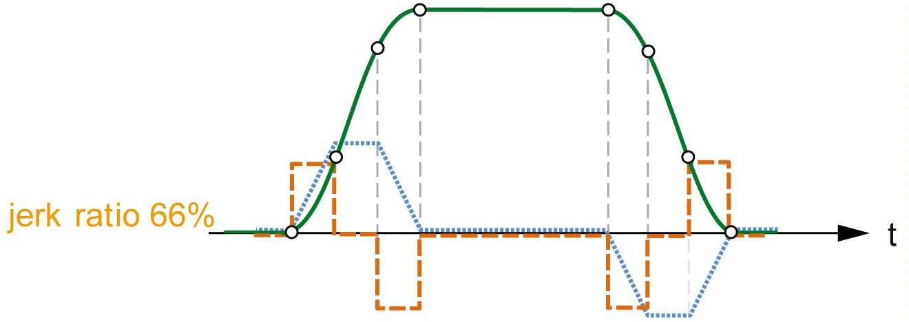 当 jerk ratio 参数大于 0 时,加速度/减速度斜度坡将具有 S 曲线轨迹。