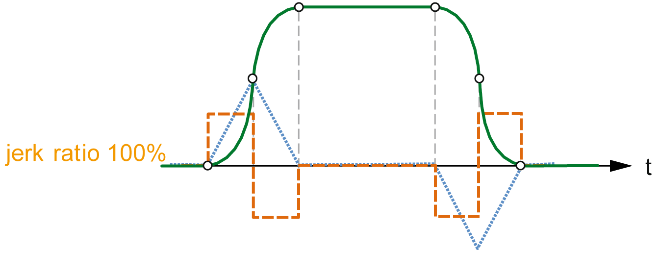 应用 100% JerkRatio 时,加速度/减速度将是 Acceleration/Deceleration 参数所配置值的两倍。