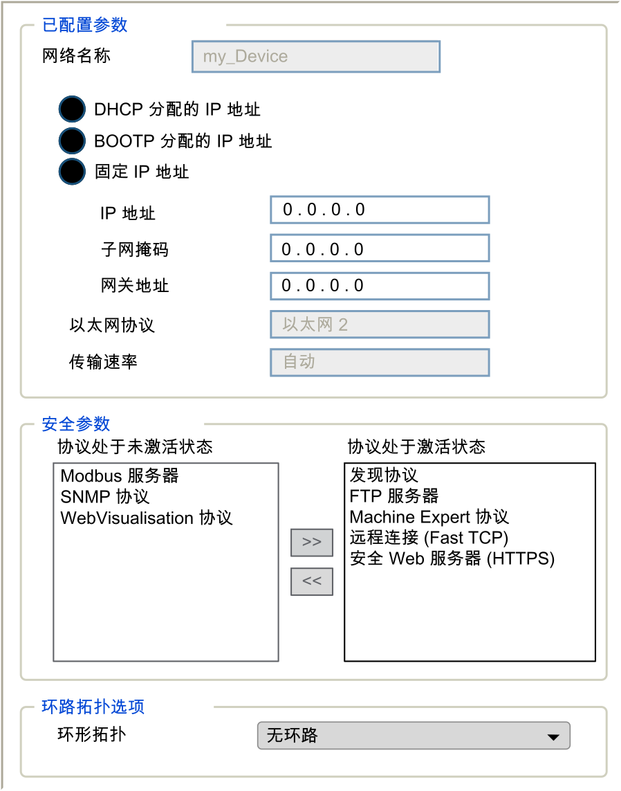 在离线模式下,可以看到已配置参数窗口,如果是 Ethernet_2,则看到的则是环形拓扑选项窗口。它们可以被编辑。