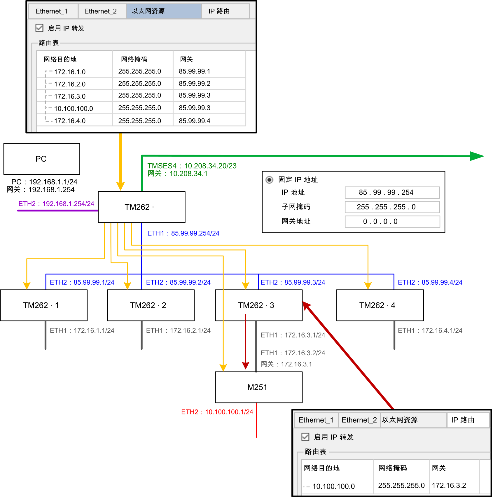 Modicon M262 Logic/Motion Controller 最多可以有 3 个 Ethernet 接口。必须使用路由表,才能与连接到不同 Ethernet 接口的远程网络通讯。网关是用于连接到远程网络的 IP 地址,需要位于控制器的本地网络中。