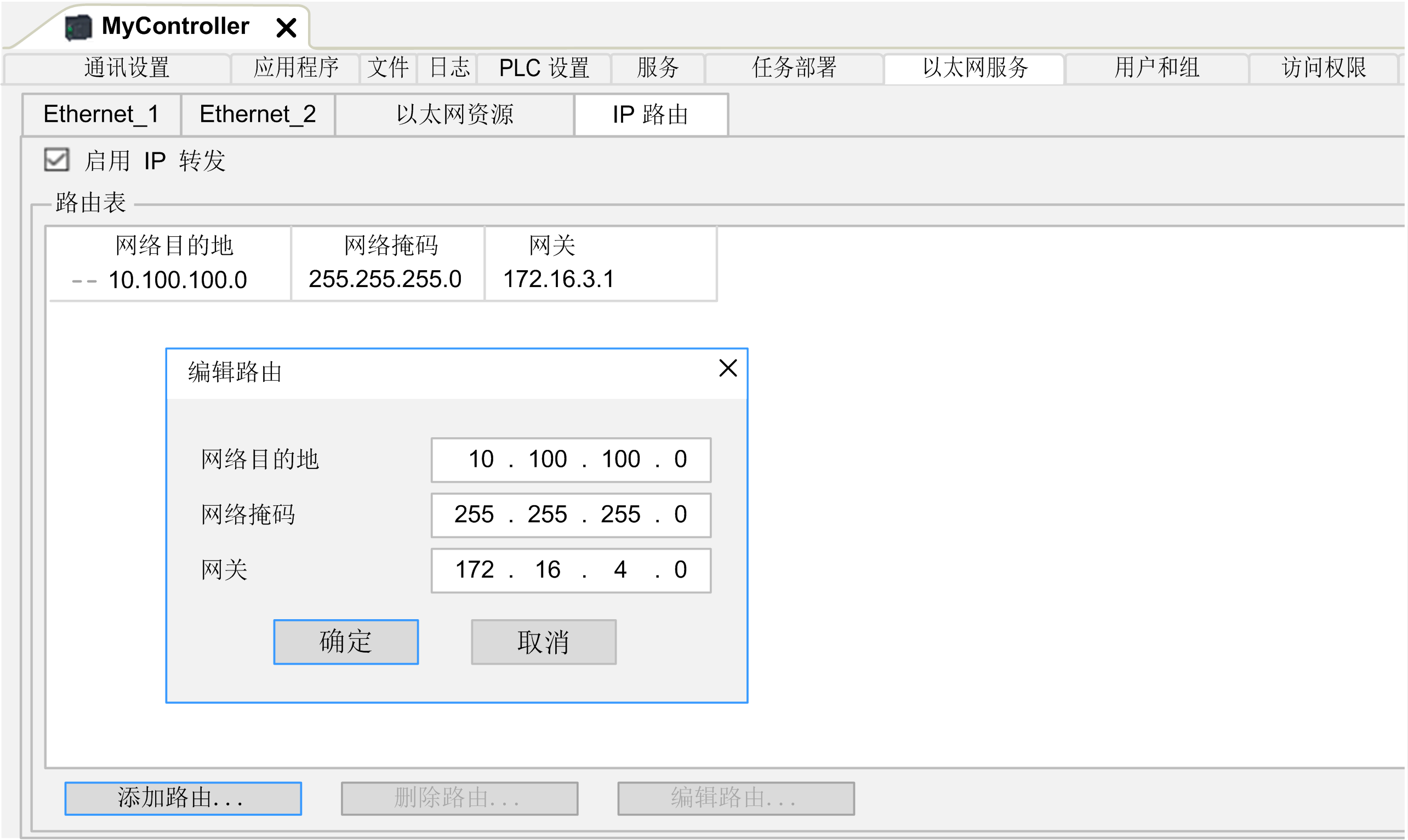 子选项卡让您能够配置控制器中的 IP 路由。