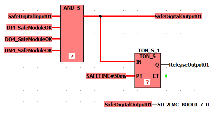 此外,SafeDigitalOutput01 被写入到布尔交换变量 SLC2LMC_Bool0_7_0,此变量属于在 Logic Builder 中 SLC 设备配置中配置的 SLC2LMC 交换数据。这样,标准应用程序就能够读取输出状态。(SafeDigitalOutputxx 信号可用于数字量输出模块。它向标准应用程序指示安全应用程序是否设置了安全相关输出)。由于允许从安全相关数据类型转换成标准数据类型,因此安全相关变量能够直接连接到标准交换变量 SLC2LMC_Bool0_7_0。