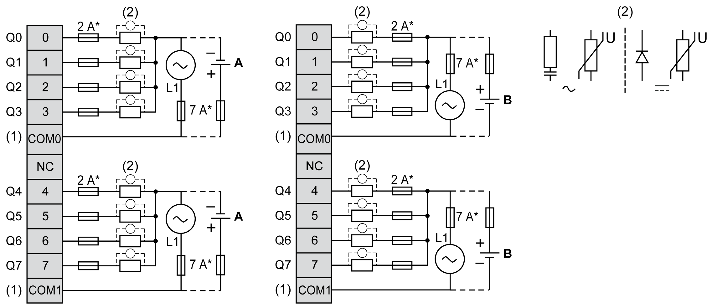 (2) 为了延长触点的使用寿命,以及防止潜在的电感式负载损坏,您必须将续流二极管并行连接到每个电感式直流负载或将 RC 缓冲器并行连接到每个电感式交流负载或任一种负载的变阻器。