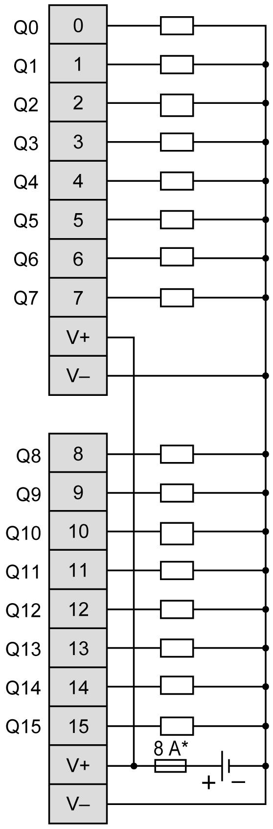 下图说明了输出、执行器及其公共端之间的连接: