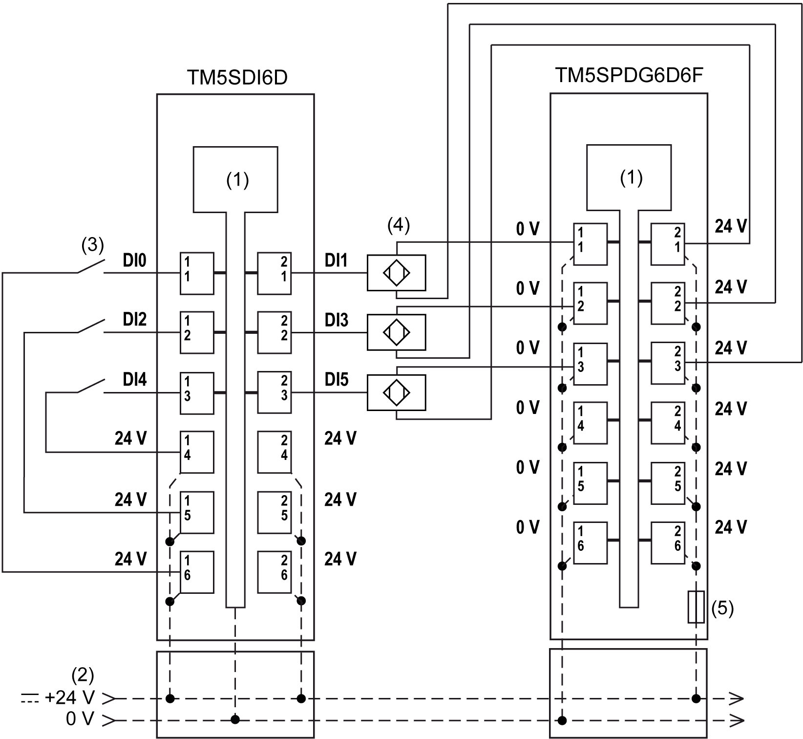 下图显示了 TM5SPDG6D6F 和 TM5SDI6D 的接线图: