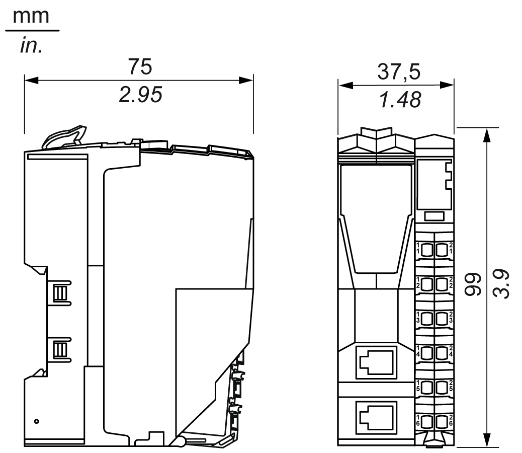 下图显示了 TM5 现场总线接口的尺寸:
