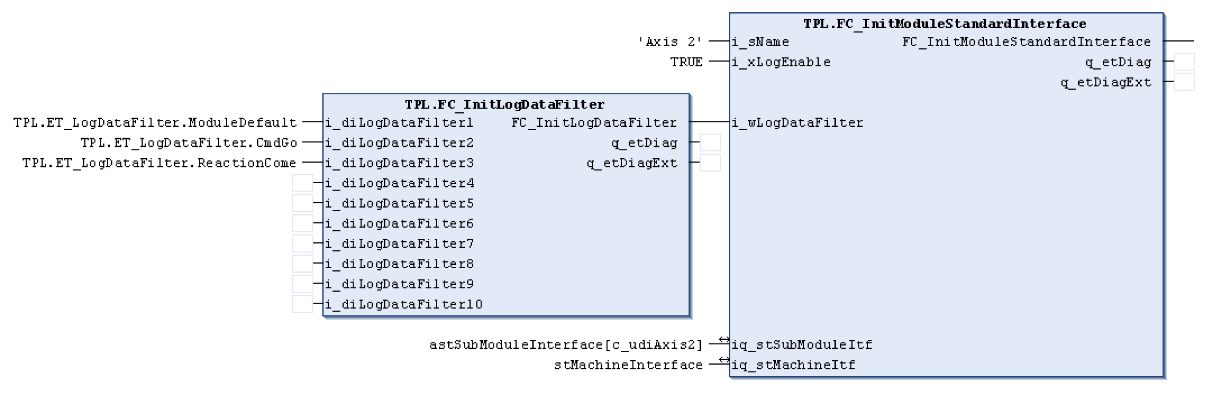 Über diese Funktion erhält die mit iq_stSubModuleItf festgelegte Achse einen Textnamen. Der Name wird mit den zugehörigen Ebenennamen kombiniert, um Fehler zu erkennen, Einträge zu loggen und Ergebnistexte für andere Funktionsbausteine zur generieren.
