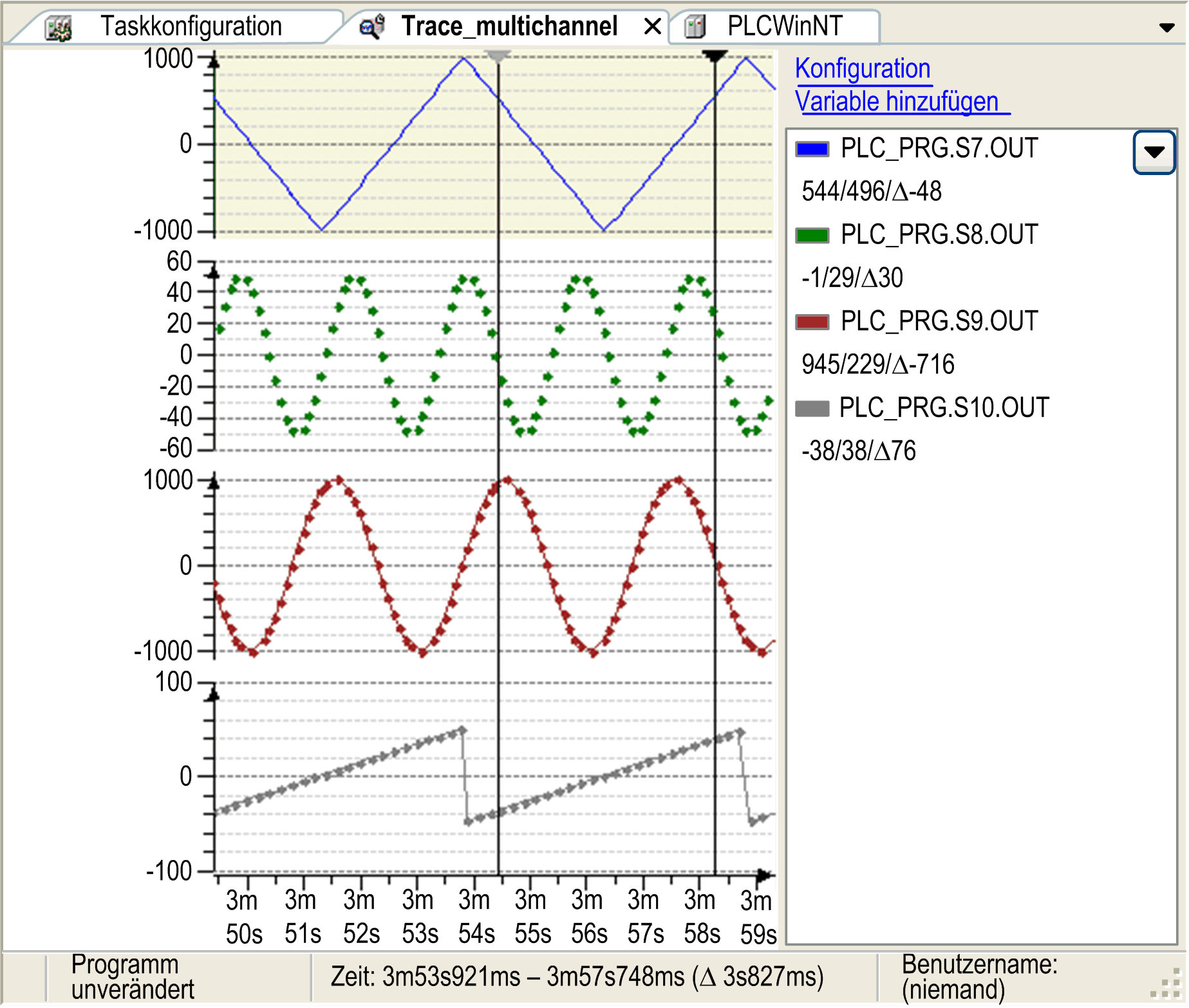 Wenn zwei Cursor vorhanden sind, wird ein Cursor ausgewählt und der andere grau unterlegt. Die y-Werte jeder einzelnen Trace-Variable, bei denen die zwei Trace-Cursors das Trace-Diagramm schneiden, werden im rechten Bereich des Editors unter der dazugehörigen Trace-Variable aufgeführt. Zusätzlich wird die Differenz der beiden Werte berechnet und neben den Werten hinter dem Delta-Symbol angezeigt. Die dazugehörigen Zeitwerte beider Cursors und ihre Zeitdifferenz in Klammern werden in der Statusleiste angezeigt.