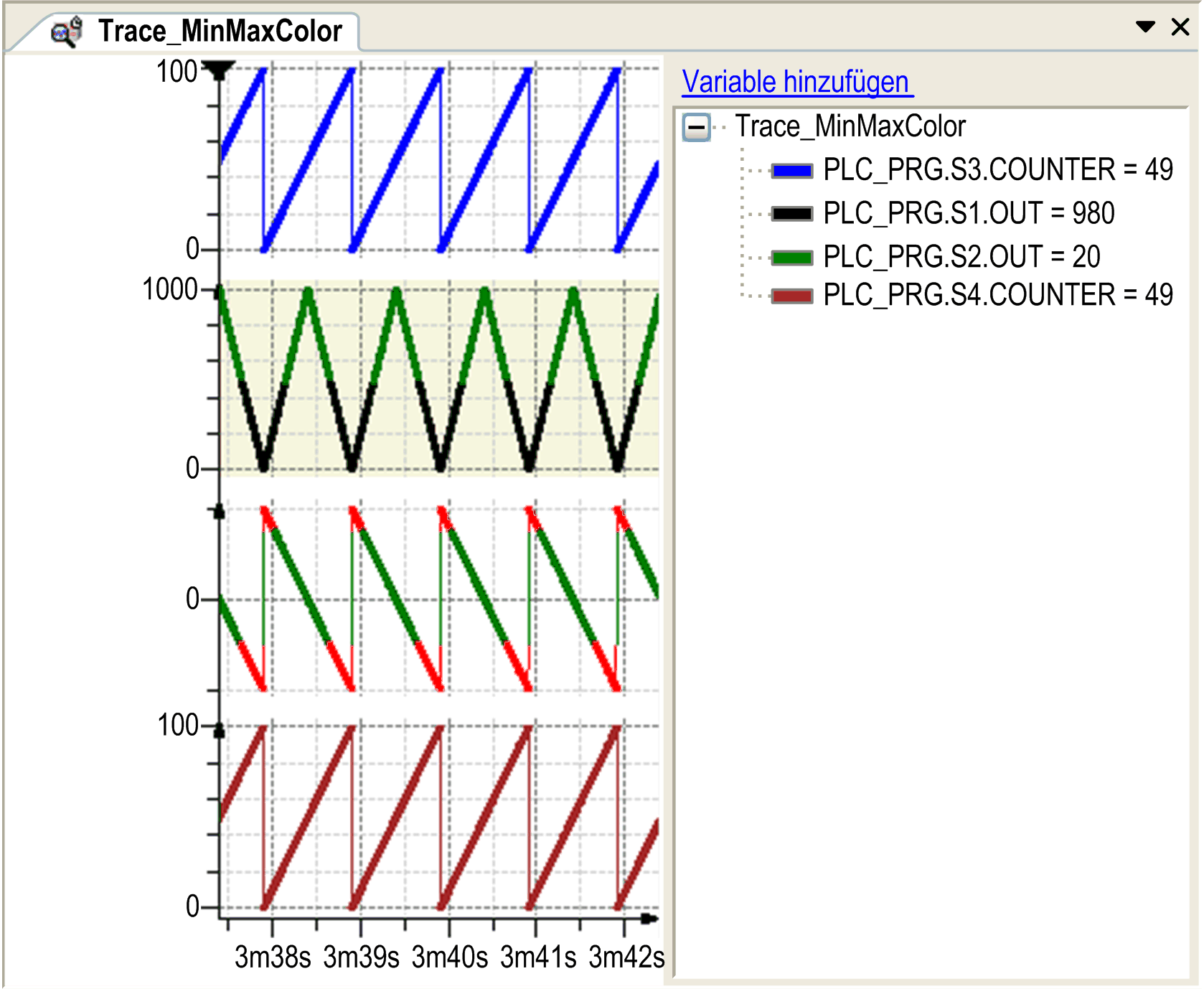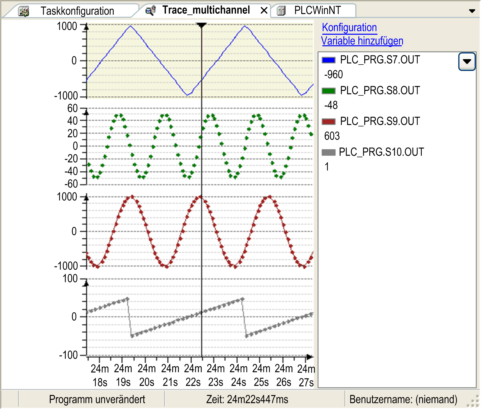 wird die Ansicht des Trace-Diagramms geändert. Die Standardansicht ist ein Diagramm mit einer x- und y-Achse, in der alle Variablen dargestellt sind. In der Mehrkanalansicht wird jede Variable in einem eigenen Diagramm, aber mit identischer Zeit- bzw. x-Achse dargestellt. Die Befehle zum Zoomen und Scrollen wirken sich auf die x-Achsen aller Diagramme gleichzeitig aus.Traceaufzeichnung im Mehrkanal-Modus
