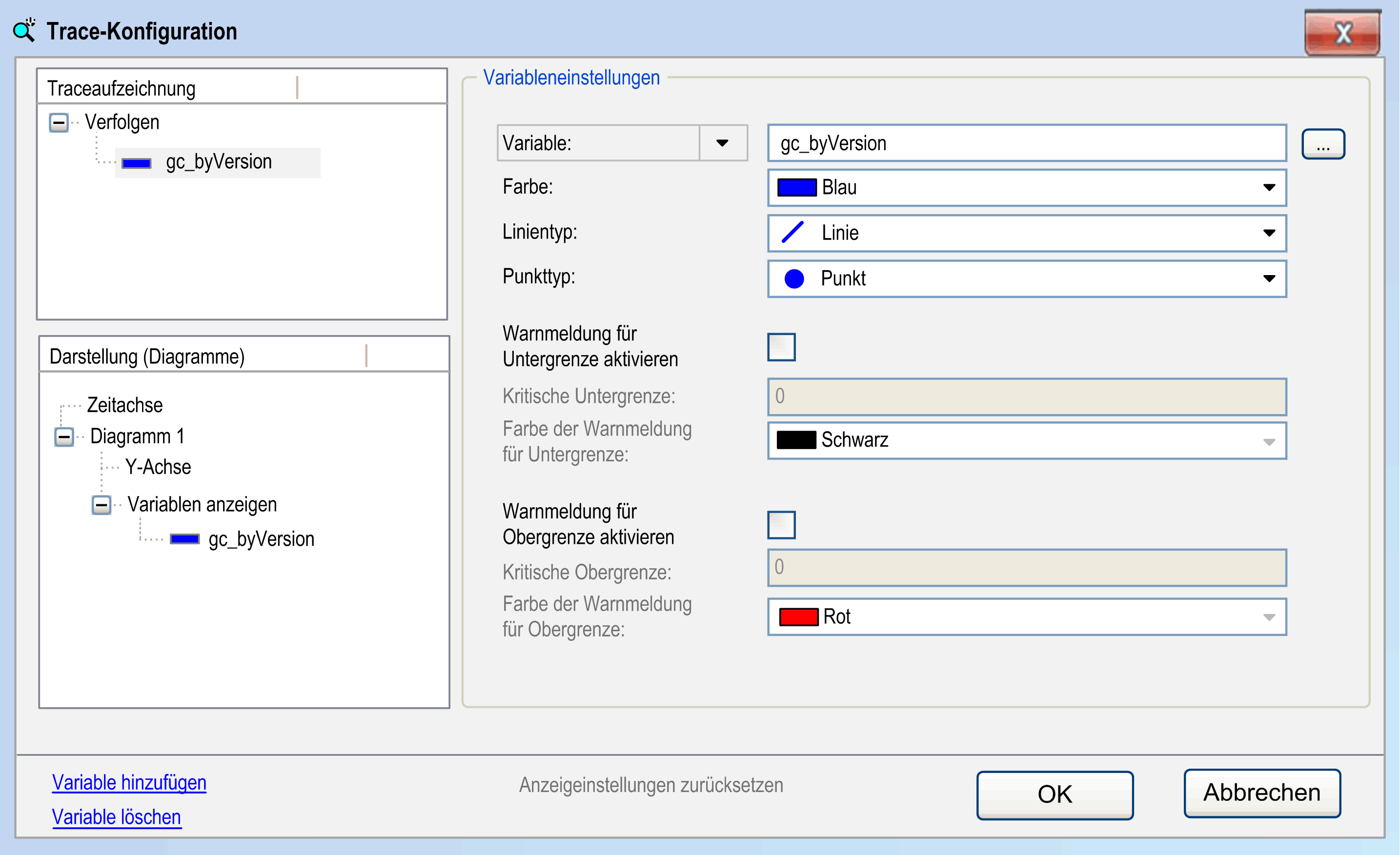 Verwenden Sie zum Hinzufügen einer Variablen zur Trace-Baumstruktur bzw. zum Löschen einer Variablen die Befehle unter der Baumstruktur: