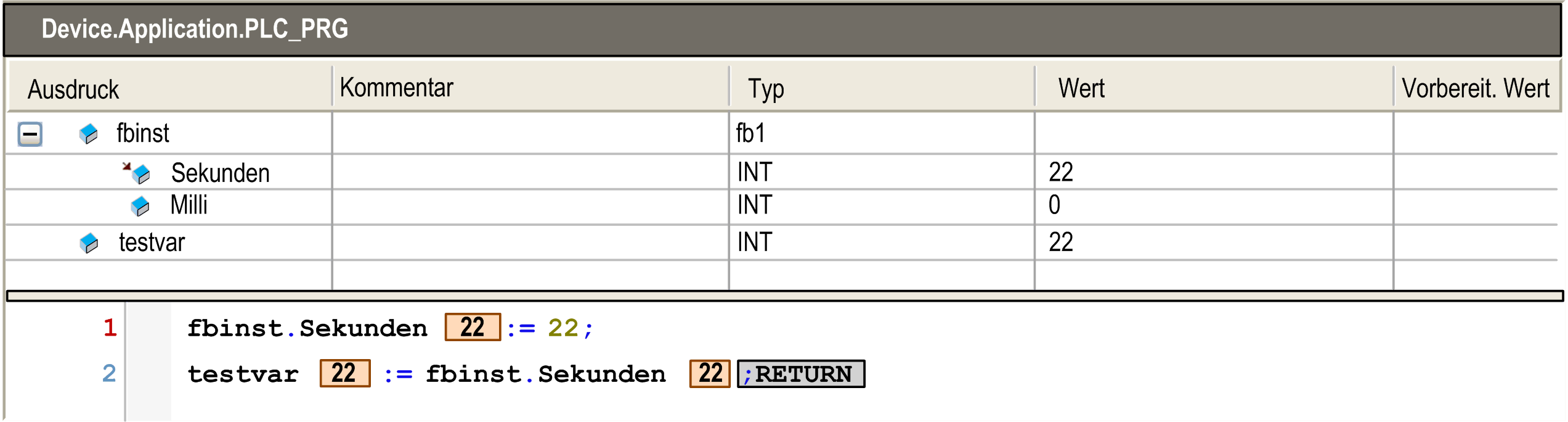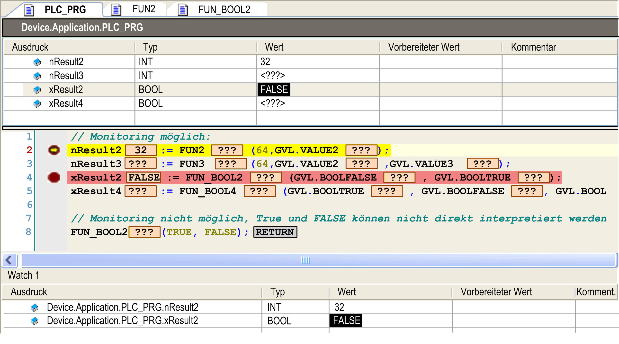 muss in der Zeile über der Funktionsdeklaration eingefügt werden. Anschließend kann diese Variable in der Texteditoransicht der Online-Ansicht der POU überwacht werden, in der eine Variable das Ergebnis eines Funktionsaufrufe zugewiesen wird. Zu demselben Zweck können Sie auch eine Variable zu einer Überwachungsliste hinzufügen. Mit dem Befehl kann eine Variable direkt aus einer Überwachungsansicht abgerufen werden.