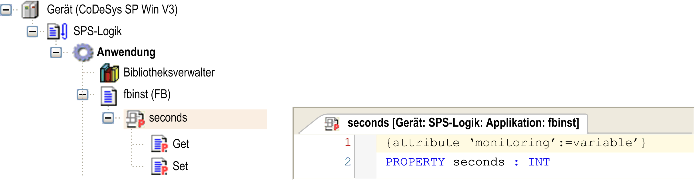 Fügen Sie das pragma in der Zeile über der Eigenschaftsdefinition ein. Anschließend werden in der Online-Ansicht der POU, die die Eigenschaft verwendet, bzw. in einer Überwachungsliste der Name, Typ und Wert der Variablen der Eigenschaft angezeigt. Dort können auch Werte für das Forcen der Eigenschaften-Variablen vorbereitet werden.