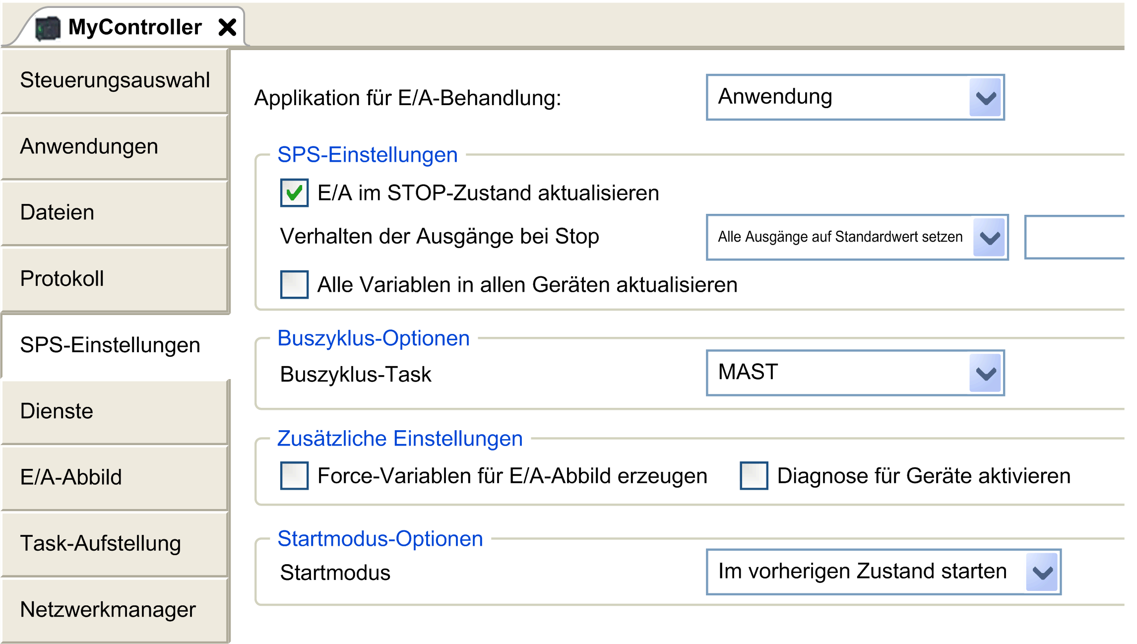 Diese Konfigurationseinstellung ist die übergeordnete Einstellung für alle Parameter derBuszyklus-Task, die in der Gerätebaumstruktur der Anwendung verwendet werden. Einige Geräte mit zyklischen Aufrufen, wie z. B. der CANopen-Manager, können einer bestimmten Task zugeordnet werden. Wenn für die Einstellung des Geräts die Einstellung Zykluseinstellungen des übergeordneten Busses verwenden eingegeben wurde, wird die Einstellung für die Steuerung verwendet. Diese Auswahlliste enthält alle Tasks, die derzeit in der aktiven Anwendung definiert sind. Die Standardeinstellung ist „MAST-Task“.