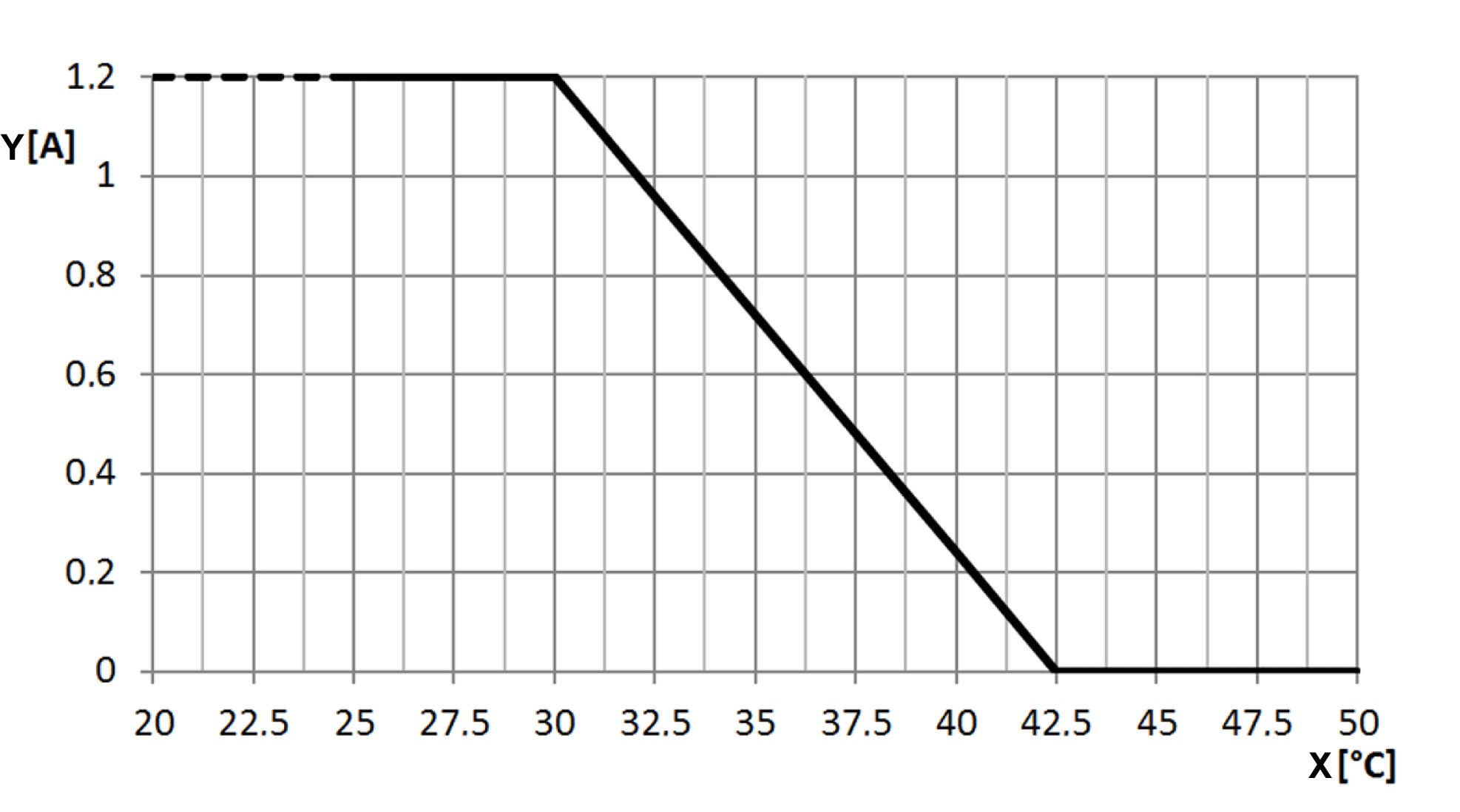 0 bis +55 °C (+32 bis 131 °F) Derating - waagrecht: ![]() x-Achse: Umgebungstemperatur [°C] y-Achse: Ausgangsstrom