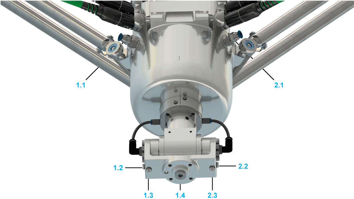 Connect the media line to one of the pneumatic plug-in connections (1.1 or 2.1) of the Double Rotational Module. The plug-in connection has a diameter of 6 mm (0.236 in). For further information, refer to Supply of the Gripper. |