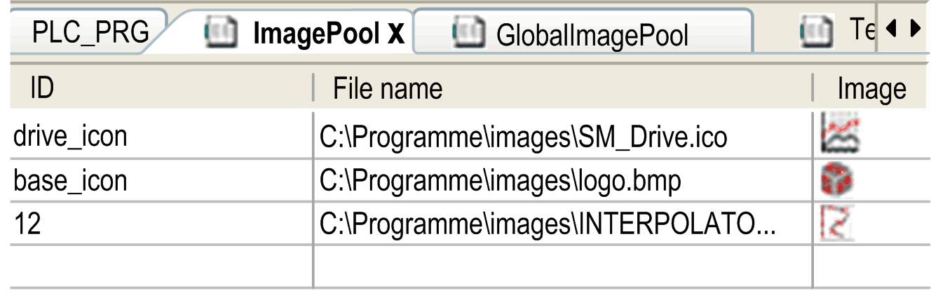 Image pools are tables defining the file path, a preview, and a string ID for each image. By specifying the ID and (for unique accessing) additionally the image file name, the image can be referenced, for example, when being inserted in a visualization (configuration of the properties of an image element, refer to Using Images Which are Managed in Image Pools ).